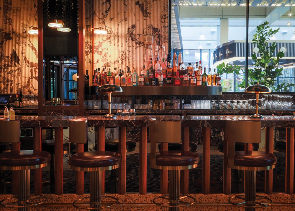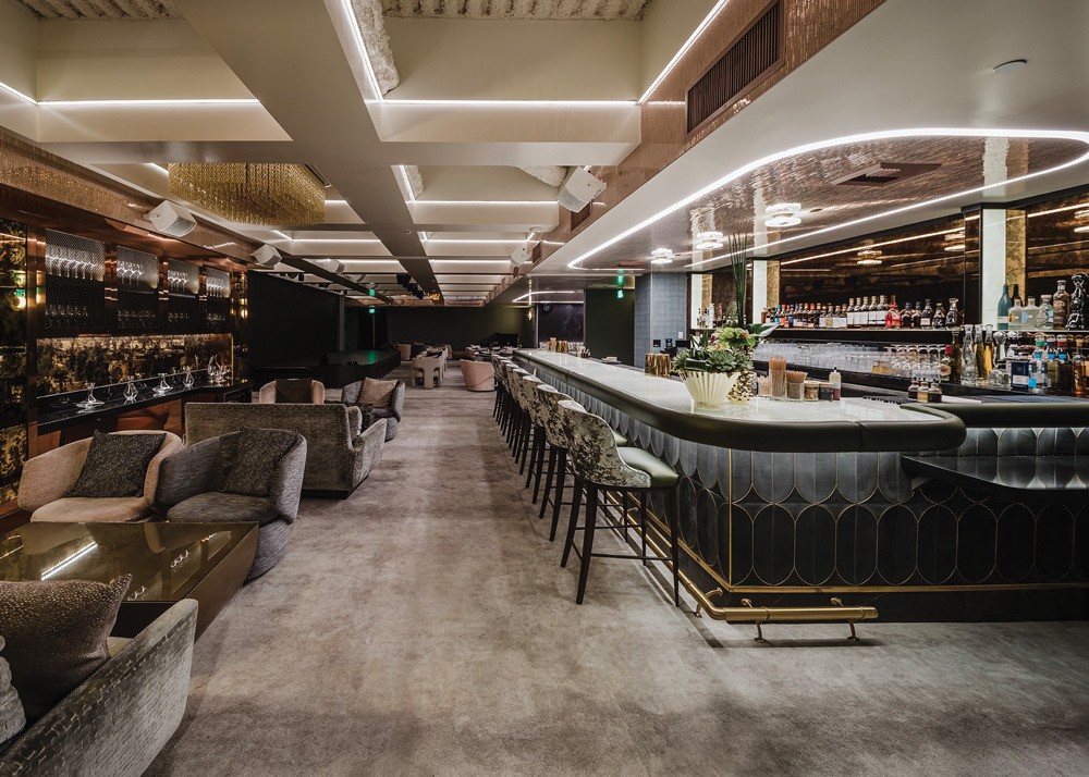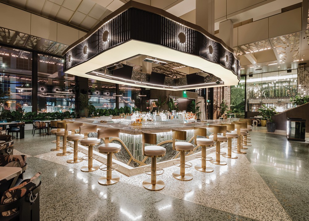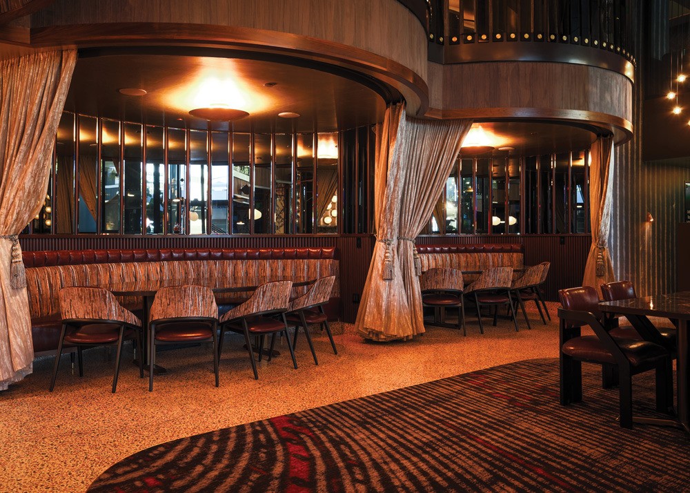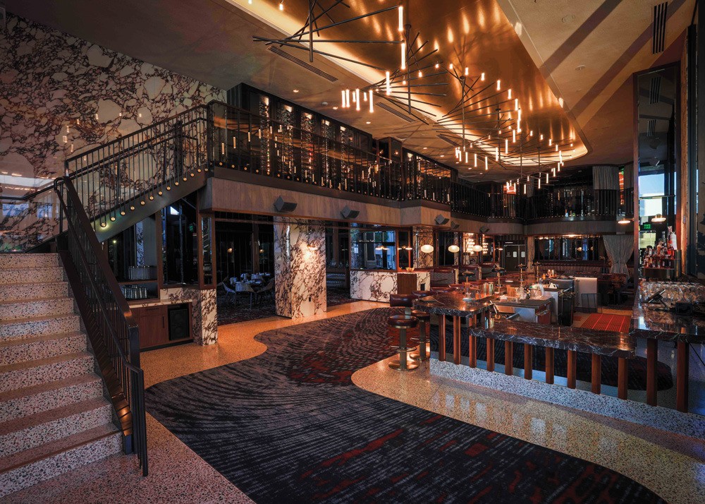 Gravitas is a 28,000-square-foot members-only club that offers open-air dining, private rooms, wine lockers and a recording studio for podcasters and other projects. Designed by Kelly Architects, the space is opulent and highly customized. Three custom murals pay homage to the city of Los Angeles, and many of the amenities reflect the concerns and hobbies of people in the entertainment business.