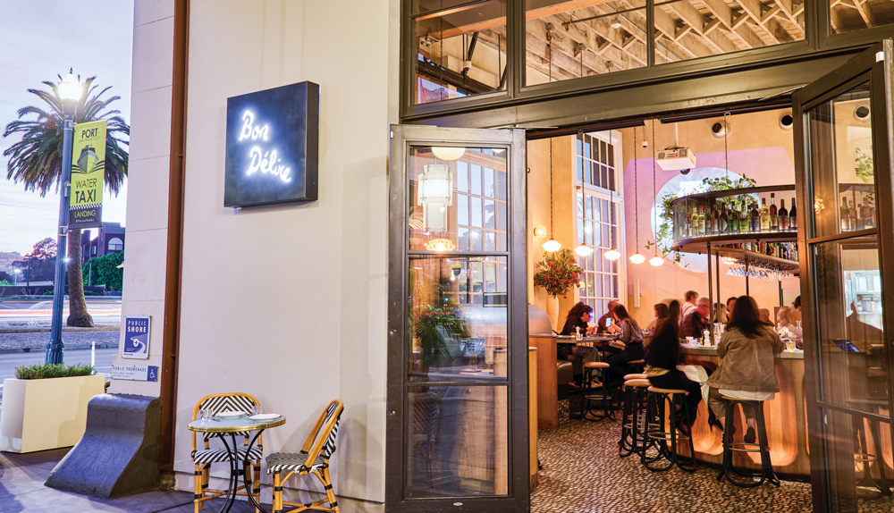A horseshoe bar anchors Bon Delire, a French bistro that opened in December 2024 near the San Francisco waterfront.