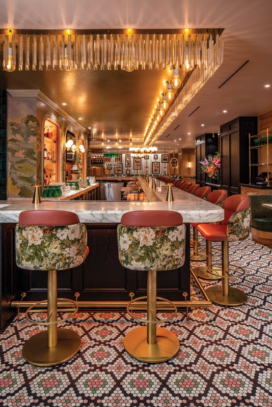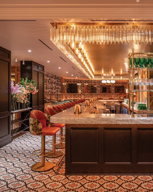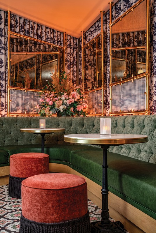 Around the back bar arches Scott commissioned a muralist to paint a French countryside, to provide a “peaceful reference of where the flowers come from,” she says. “We wanted it to feel like a painting that had been there for a long time and deliberately stayed away from Eiffel Tower references.”