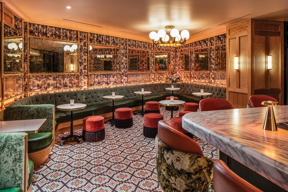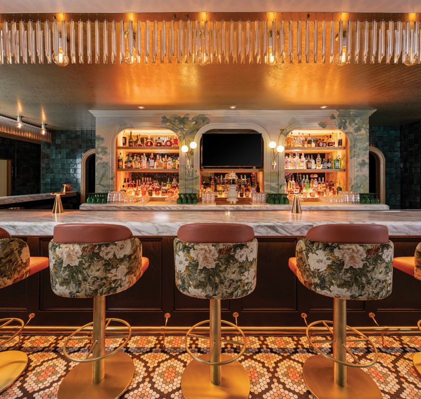 Scott created a grand moment at the bar by installing a crystal valance above it, illuminated by socket-mounted pendants from behind. This, she says, “sparkles and has a petal essence, and has some movement but feels solid. It has a marquee feel, and it glimmers and glitters.”