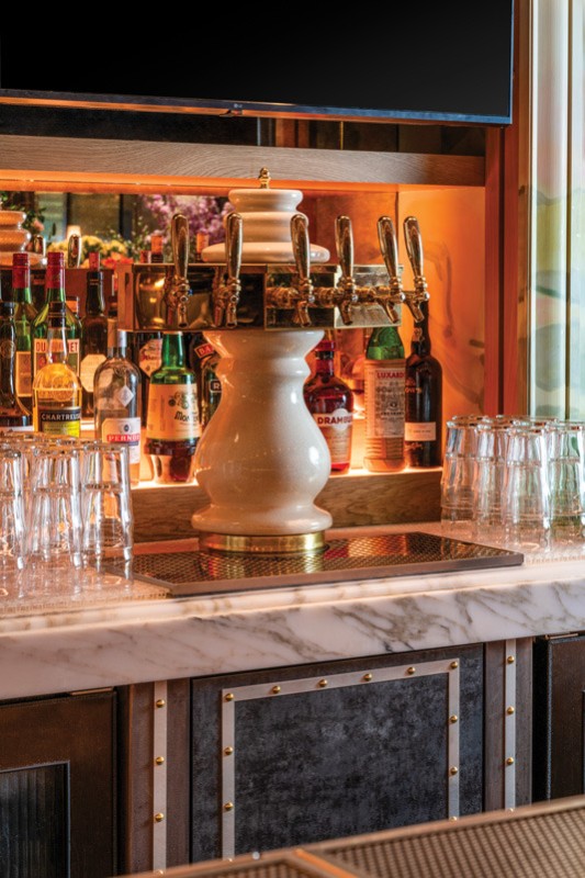 The back bar was inspired by French ranges and is comprised of framed drywall arches with millwork shelving. Two arches are filled with bottle displays, and the central one includes a TV. “We paid a lot of attention to the back bar and the lower portion of the back bar because it’s so visible from everywhere in the restaurant,” says Scott.