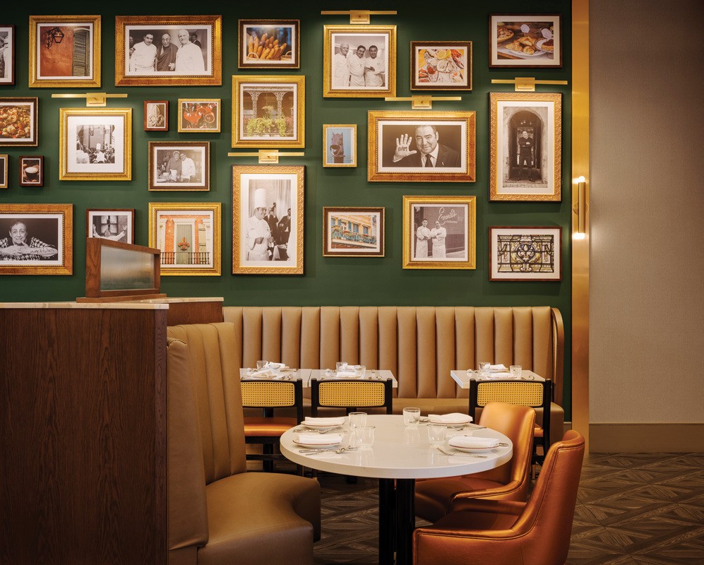 Since Emeril Lagasse got his start in New Orleans, he wanted the brasserie to have some personal design features, which include a gallery wall of photographs and a signed chef’s coat over the host stand.