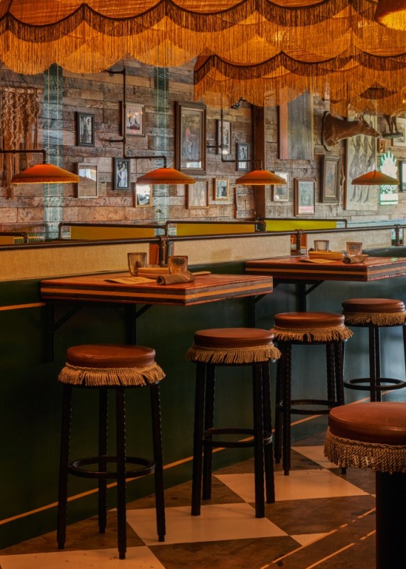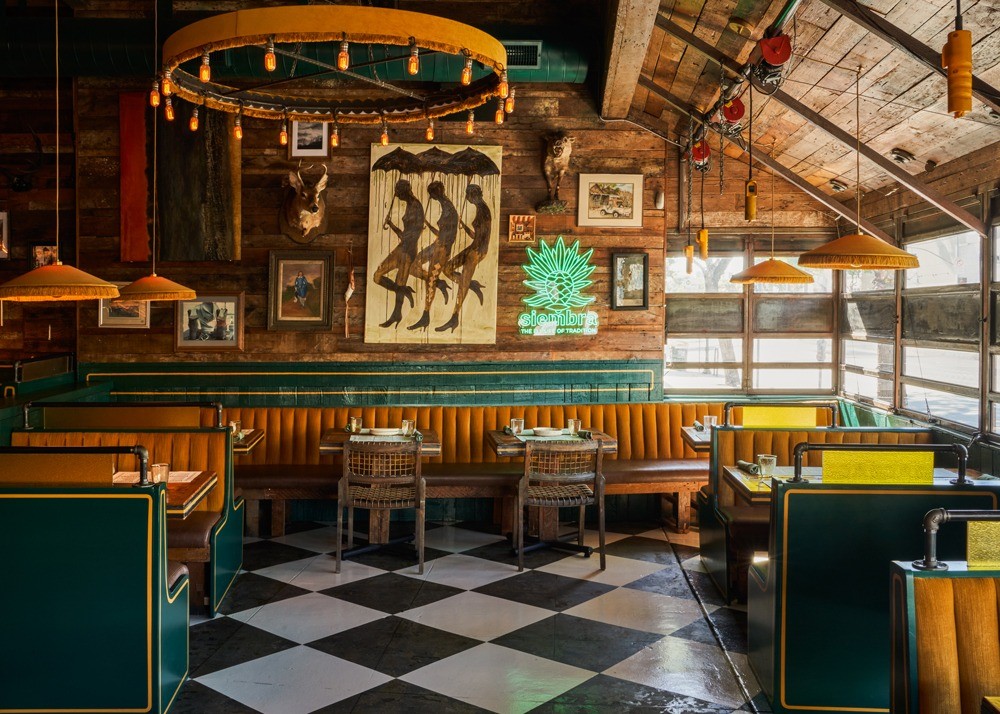 Drawing inspiration from the traditional vaquero, or cowboy, aesthetic, the design combines rustic tavern elements with layered colors and mixed textures. A palette of vibrant greens and yellows complements the building’s existing hacienda details and terracotta accents. Oil-painted portraits, taxidermy, neon signage and other vintage pieces (sourced by Egan from Mexico) punctuate the dimly lit interiors.