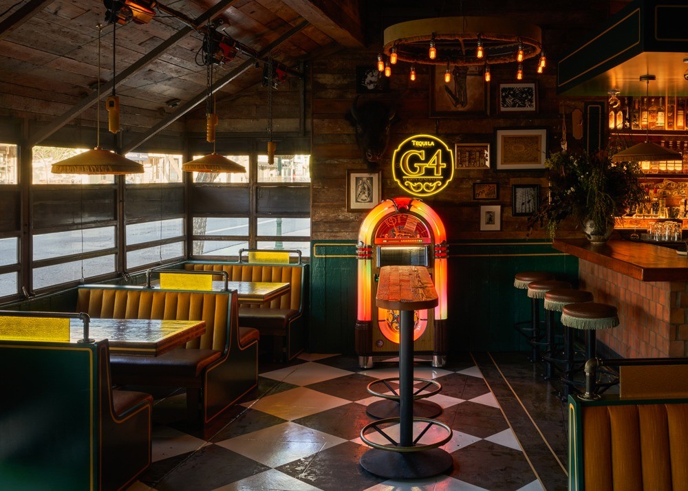 A custom-built jukebox adorned with fringe, leather and wood paneling serves as a focal point, a dive bar influence within the cantina concept.