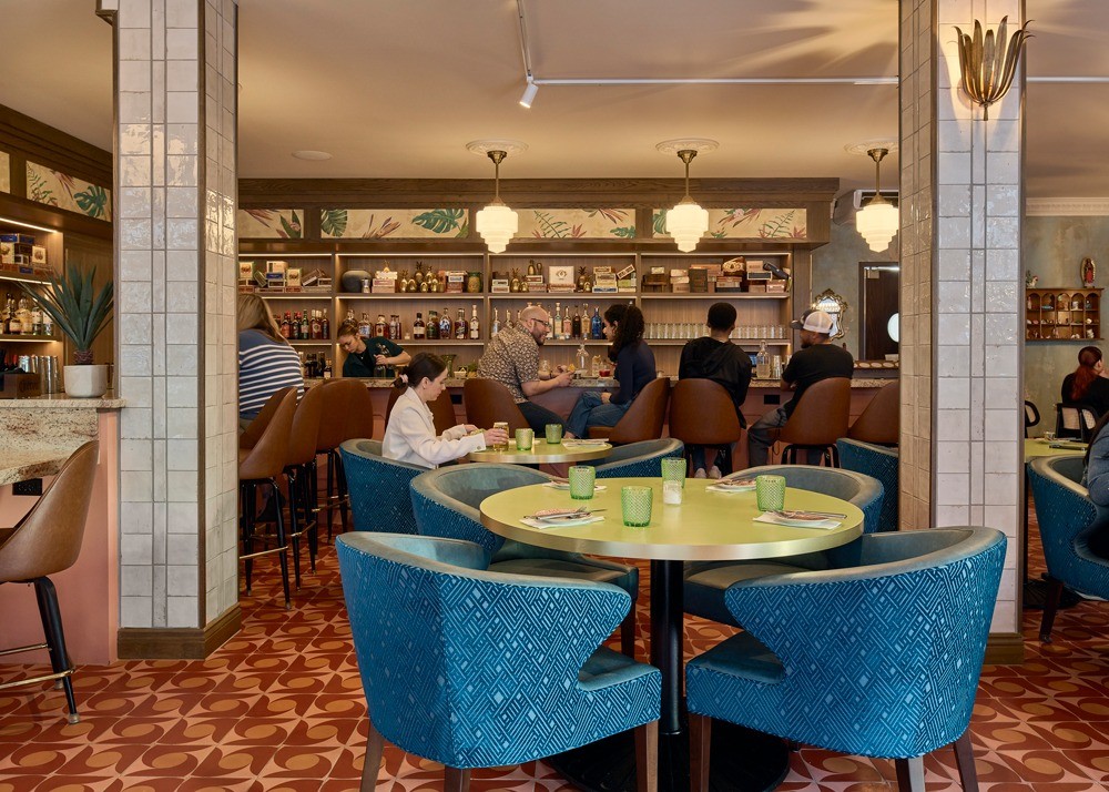 Guests are welcomed at a hand-painted to-go window serving espresso and empanadas before entering a vibrant lounge defined by aged cement tiles, patinaed walls and wrought iron detailing.