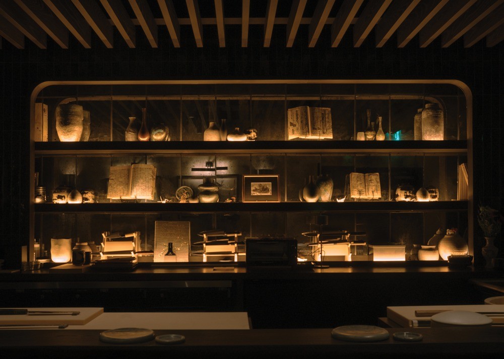 LED lights around the omakase bar create a warm glow, and the bar’s u-shaped design encourages guest interaction with each other and the chefs.