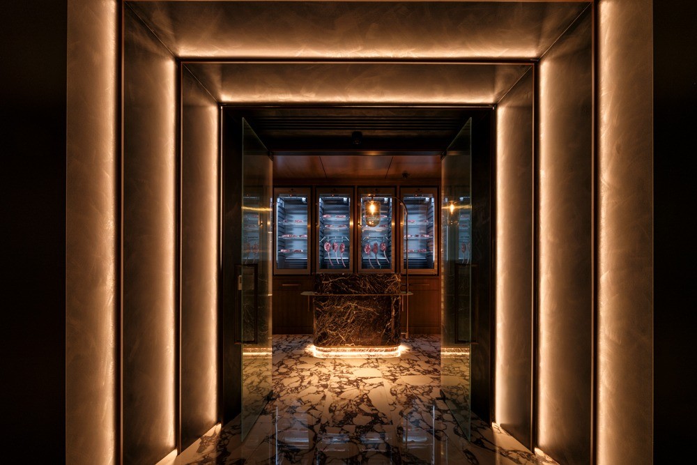 The interior, designed by The Johnson Studio at Cooper Carry in partnership with Noble 33’s in-house team, features subtle references to the game throughout. A narrowing entry corridor is modeled after a stadium tunnel, while refrigerated dry-aging displays provide a preview of the menu. The ground floor includes a central bar, live music stage, and banquette seating, while the second floor houses private and semi-private dining spaces with views into the open kitchen.