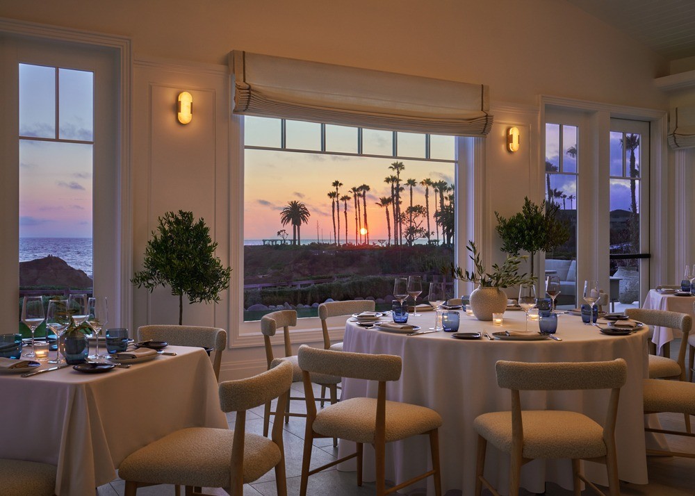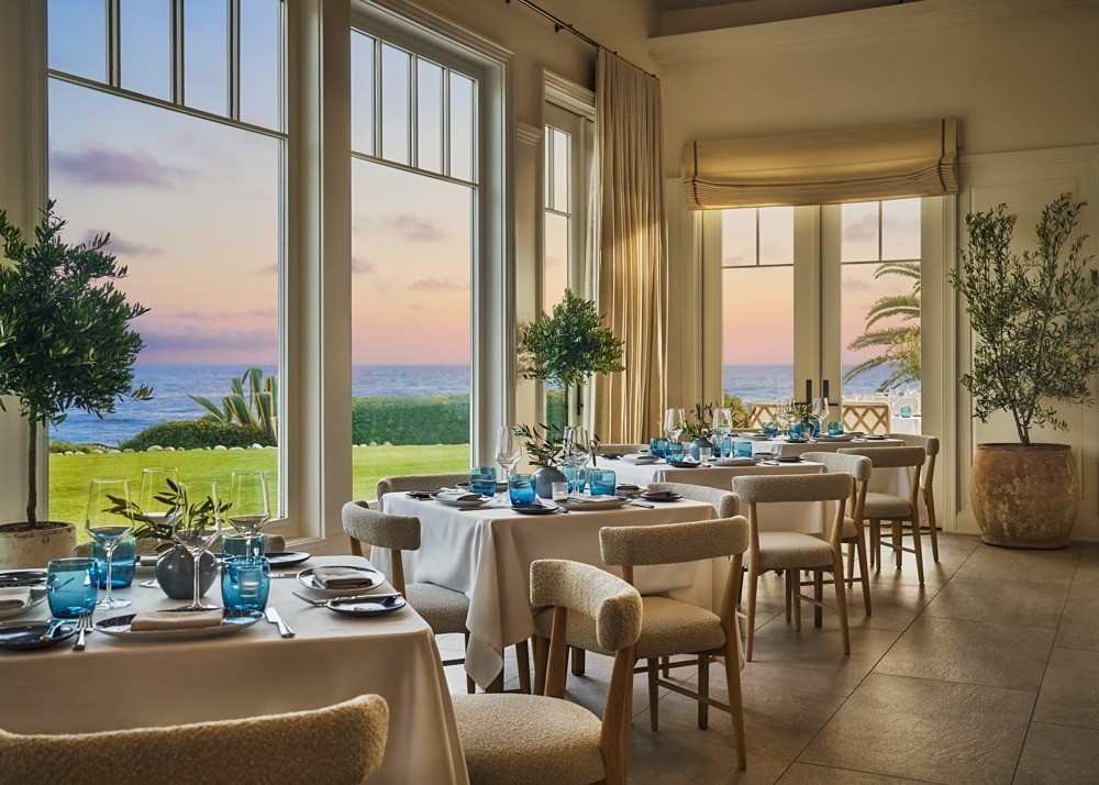 Upon entering the oceanfront restaurant, guests are greeted with crisp white beamed ceilings and floor-to-ceiling windows that frame panoramic views of the Pacific.