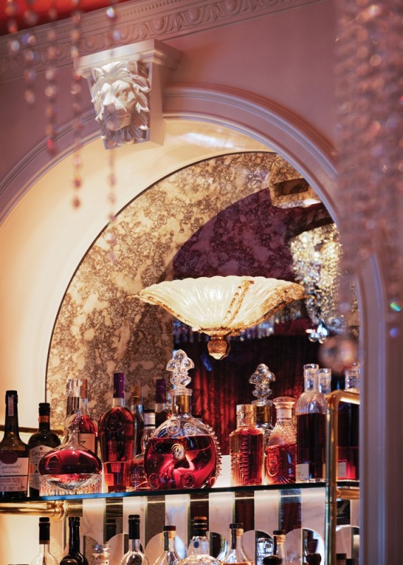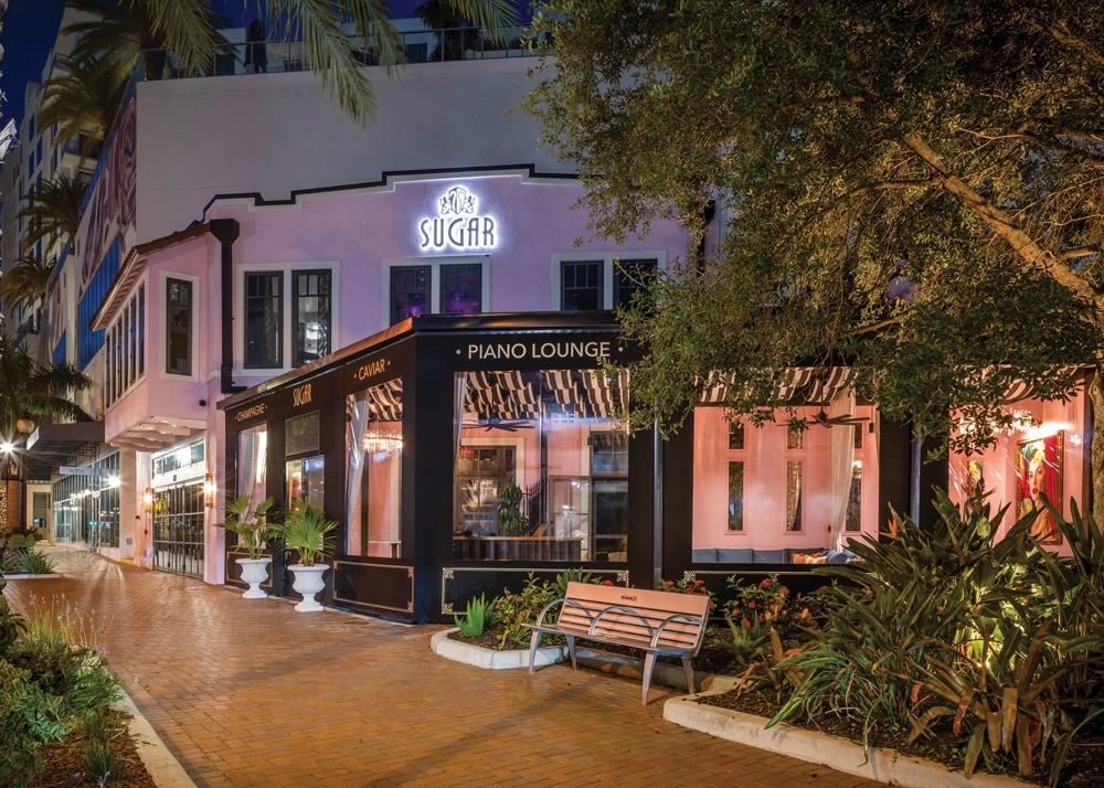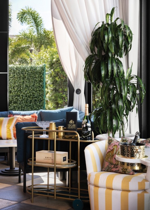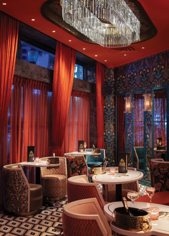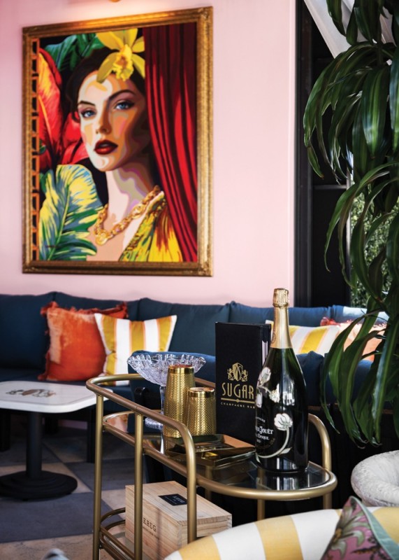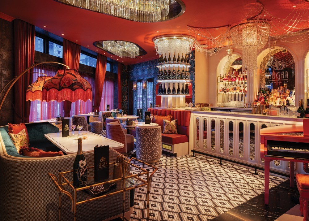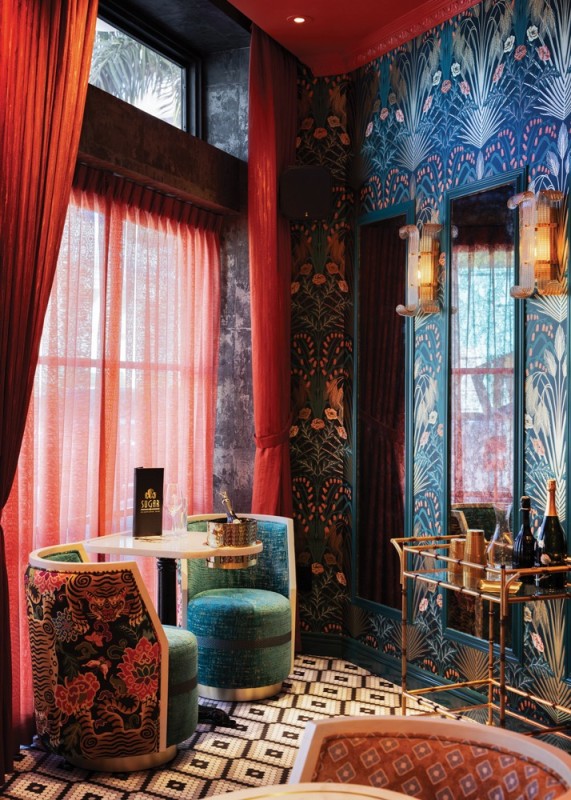 Texture plays a key role in the sensory experience at Sugar Champagne Bar. With interiors by Blok Design Group, the 1,000-square-foot elevated champagne bar features velvet banquettes, marble surfaces, lacquered finishes and patterned wall coverings that create tactile richness and depth. Rich, moody tones like deep corals, soft pinks and bold teals are paired with gold accents and theatrical lighting to create visual drama.