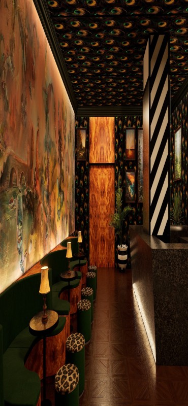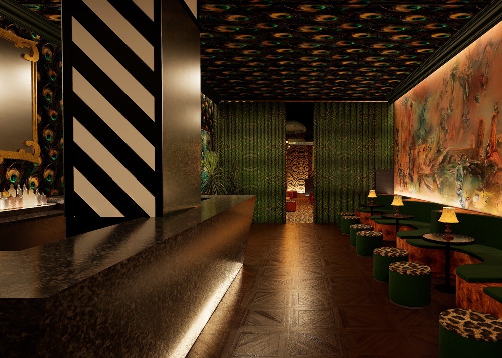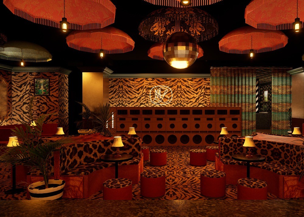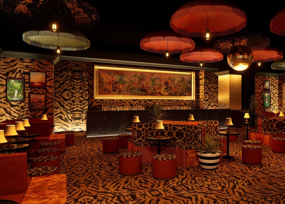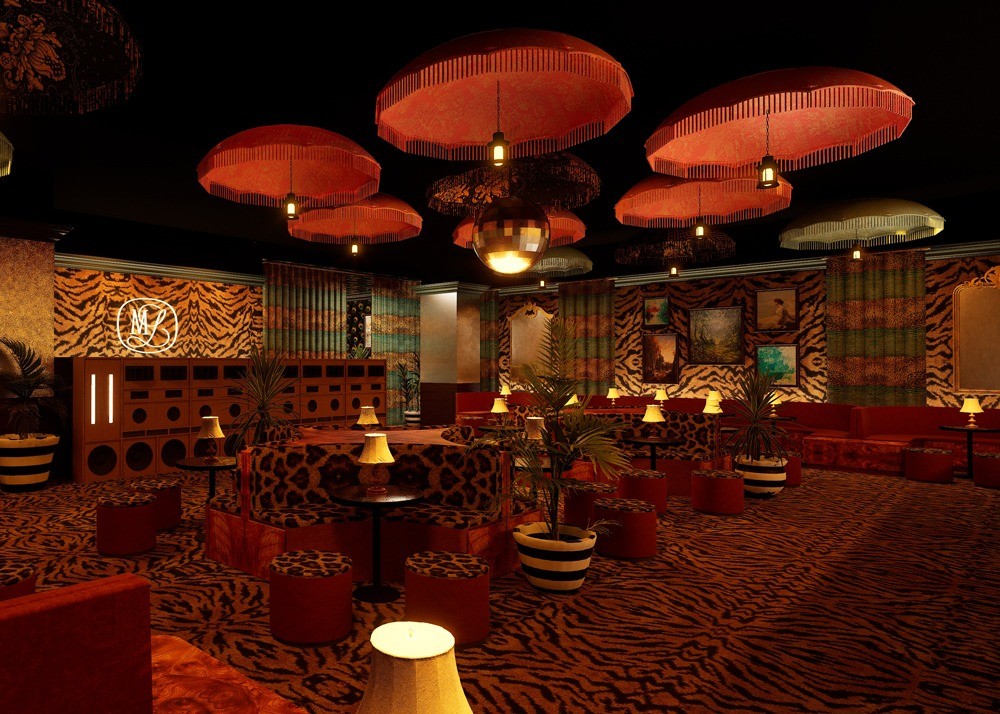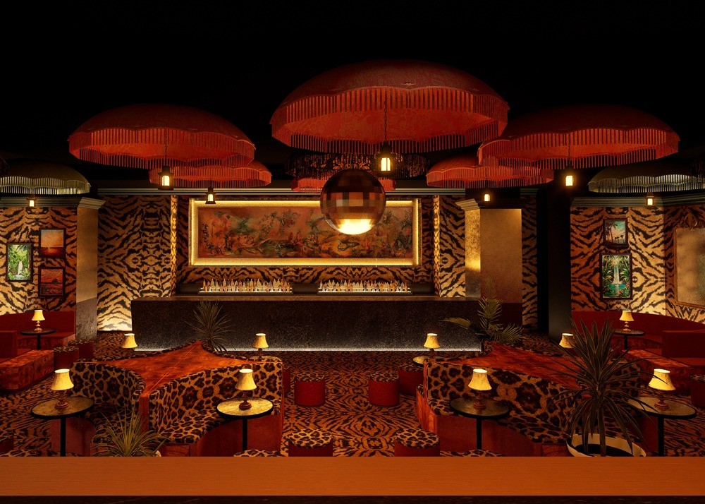 Designer Jason Volenec led the interior reworking of the space. The design incorporates patterned wall coverings, animal prints and layered textures, drawing from the brand’s established visual language while referencing Miami Beach nightlife. The redesign emphasizes low lighting, dense materiality and flexible zones that accommodate dining, cocktails and dancing.