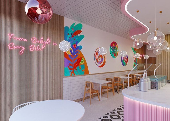The project, led by Mindful Design Consulting, offers an important lesson in cohesive branding. From logo and branding to interior design, space planning and commercial kitchen design, Swirlicious leans on its confectionery inspiration to deliver swirling graphics and bright pinks. The result is a cheerful, stylish and ultra-feminine destination for customers to indulge in frozen yogurt.