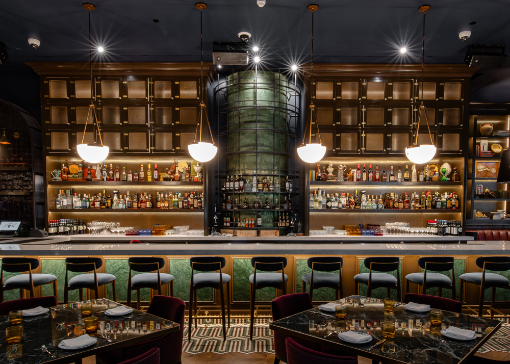 With interiors by Blok Design Group, the 1,000-square-foot elevated champagne bar features velvet banquettes, marble surfaces, lacquered finishes and patterned wall coverings that create tactile richness and depth.