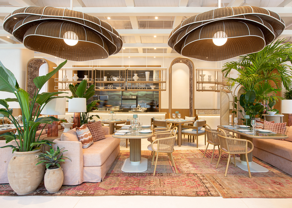 Designed by AvroKo with construction management services from Shawmut Design and Construction, the 7,000-square-foot space has a custom storefront, an outdoor dining area, two bars, multiple private dining areas, and an expansive open kitchen with chef’s table.