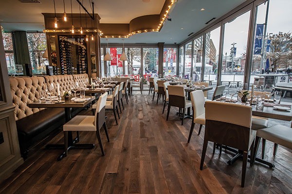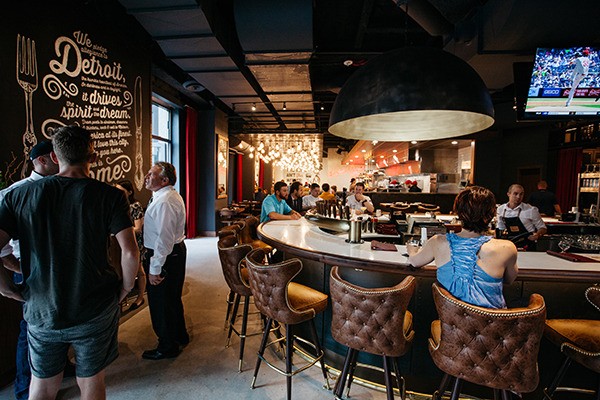 The 2,600-square-foot restaurant offers a bright and airy space flooded with natural light via a custom-designed 10-foot glass wall system that provides views of — and, on warmer days, opens up to — Campus Martius Park, the Woodward Fountain and downtown Detroit. Near the entrance, a 30-foot bar with a tiered liquor display attracts patrons during all dayparts. The 140-seat dining room is a mirror of itself on either side of the entryway with modular banquettes and large round booths that accommodate parties of all sizes.