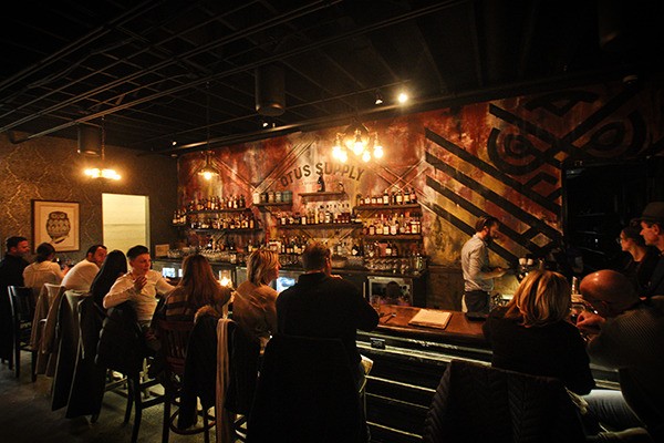 Dark woods and ebony-stained tables, gray flannel seating surfaces and raw steel shelving elements create a modern industrial aesthetic. The open kitchen sits along the back wall and is visible from the bar, which is made from salvaged wood from 1950s-era bowling alleys and lined with jars of syrups, infusions and juices for craft cocktails.