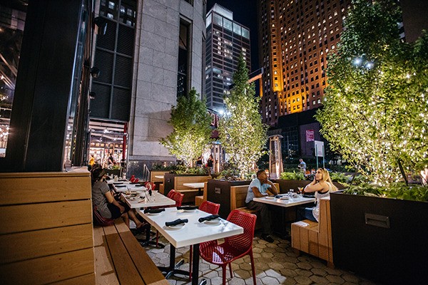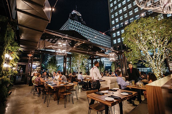 Set on the ground level of One Detroit Center in Detroit’s Financial District, Townhouse, helmed by veteran Chicago Chef Greyson Kindy, blurs the lines between casual and upscale, inside and outdoors. The 7,484-square-foot, 314-seat restaurant, designed and constructed by McIntosh Poris Associates, features several distinct zones, the centerpiece of which is a custom-designed 1,800-square-foot steel and glass atrium with operable roof and walls. The glass roof panels quickly open, weather permitting, and immerse diners in the modern cityscape, while exposed ventilation ducts and structural beams draw attention to the structure itself.