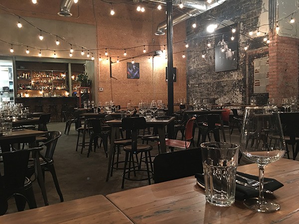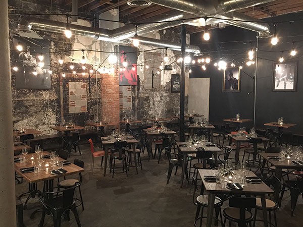 In the 87-seat open dining room, the industrial style dominates with blacks, grays, polished plywood and concrete. It is balanced by pops of signature orange, live plants and candle lighting. Local artwork is featured throughout the space along with vintage rock-and-roll images printed on large-scale canvas by local photographer S. Kay Young.