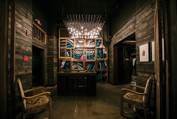 In the Owl Wing Room, a 50-foot graffiti mural pairs with 15-foot glass doors that rise and open to the patio. Famed local artists were tapped for grand paintings, custom woodwork, and a marble- and copper-topped bar, while the furniture is an eclectic mix of pieces handpicked from local vintage outlets and during Bloom’s pilgrimages to places like France. Music venue The Parliament Room also features a 50-foot bar and chef’s counter.