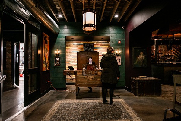 At the front entrance, floor-to-ceiling windows provide views of Watson Street. Guests are greeted by a real steer skull, a 15-foot steel bookcase holding greenery and design pieces, and a chandelier fashioned by the owners using an antique chicken rack and Edison bulbs of various sizes.