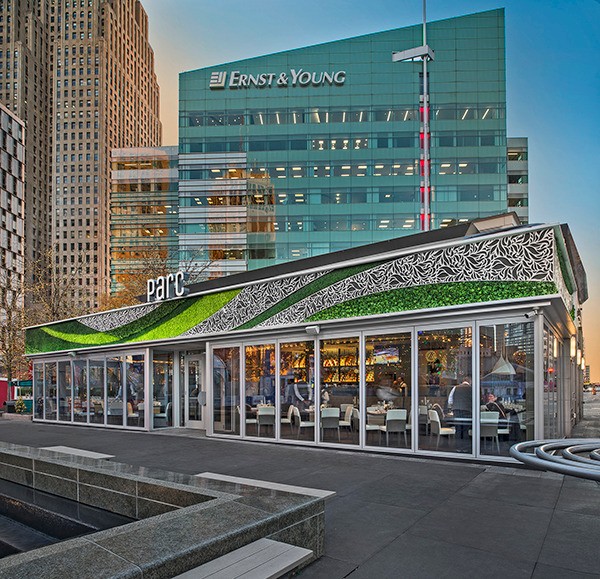 The integrated lighting system has more than 20 different event settings and is a mix of LED recessed cans, custom copper marquee panels and Edison bulbs. The super-efficient 400-square-foot kitchen uses a custom-designed cooking suite complete with an Argentine-style live fire grill where cooks prepare menu items like wood-grilled baby back ribs, homemade pasta dishes and seafood. Outside, designers extended the park into the restaurant using a green leaf-and-grass motif that blends into the surroundings.