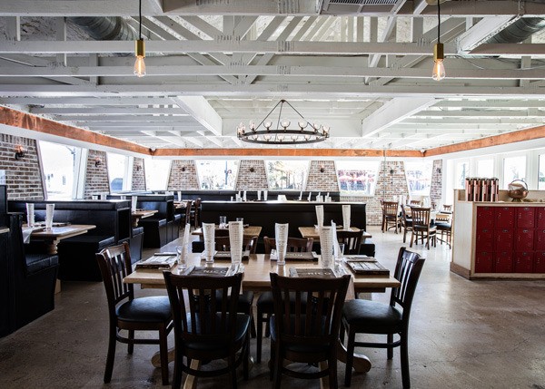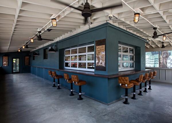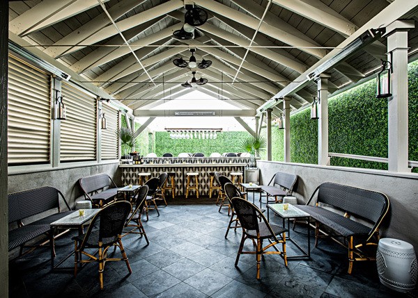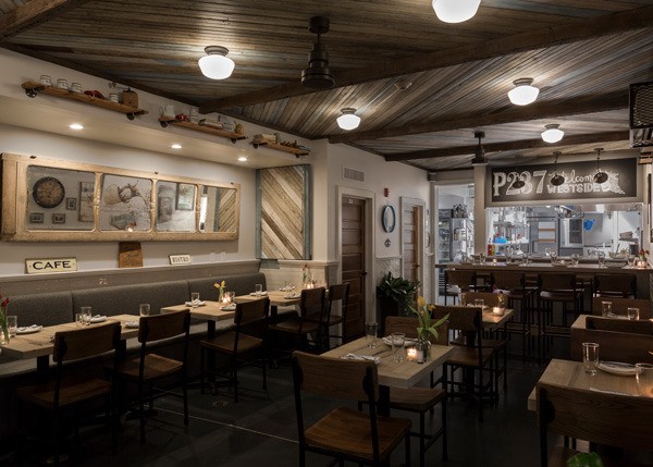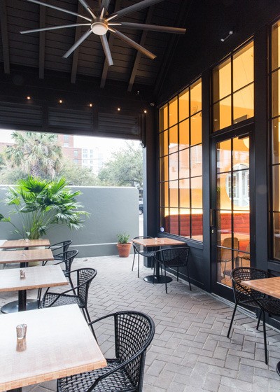 The original structure features private and reserve dining rooms with original, refurbished heart-pine floors. The addition houses the main dining room, a bar and a covered patio with high ceilings, pink plaster walls, terrazzo floors and a glass entryway. The addition also allowed for additional windows and more natural light.