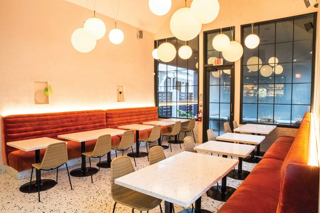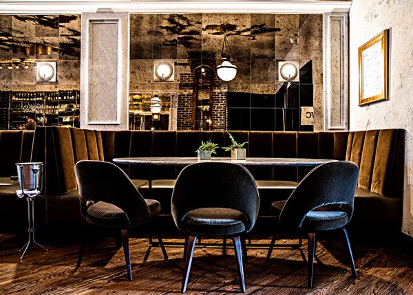 The 70-seat restaurant features natural white oak, custom-made floors and cabinetry, large subway tiles, and a Namibia Marble curved bar. Three antiqued, arched mercury glass mirrors stretch nearly to the ceiling above tufted caramel-colored banquettes. Splashes of cobalt blue are found throughout, including on the barstool chairs.
