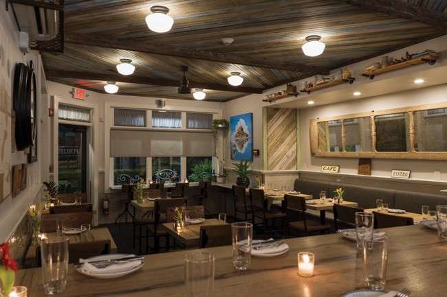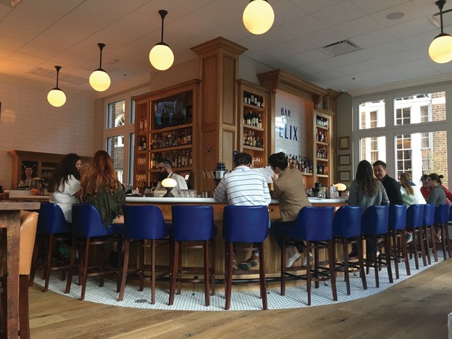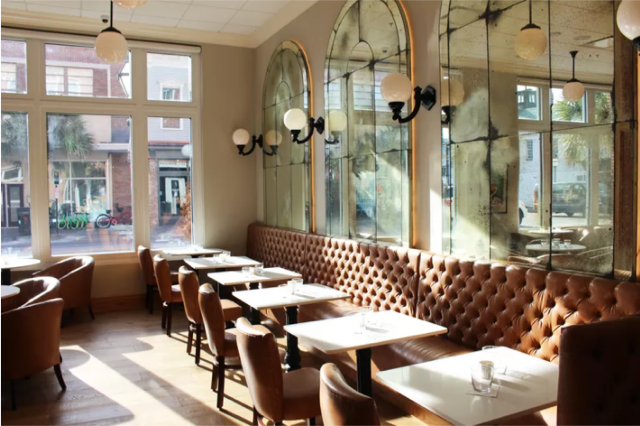Designer Leslie Landrum, in partnership with her husband Felix, modeled the design of their new restaurant after Parisian cafes. The bar curves around the side of its 2,000-square-foot corner space, taking full advantage of the windows that overlook King Street.