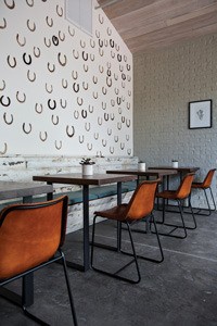 Designer Betsy Berry of B. Berry Interiors pressed horseshoes into a heavily plastered wall and then removed them, leaving reliefs, which she then painted, creating a heavily textured custom design element. She made around 40 indentations and also hung about 25 shoes on the wall. The space also features a blue and white bull mounted on the wall and more custom-designed elements made by local artisans.