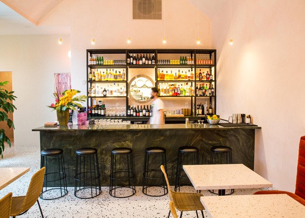The design — imagined by Zucker’s mom, LA-based designer Terry Zucker — draws in elements of traditional Parisian bistros in the form of unobtrusive overhead lighting, a reclaimed mirrored door spanning the length of one wall, and striped serving plates.