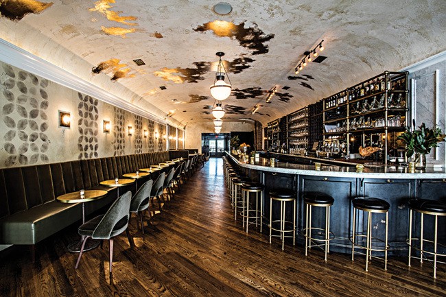 A color scheme of gilded gold and creamy white is warmed up with wooden plank floors, hand-plastered walls, mohair-upholstered seats and velvet banquettes.