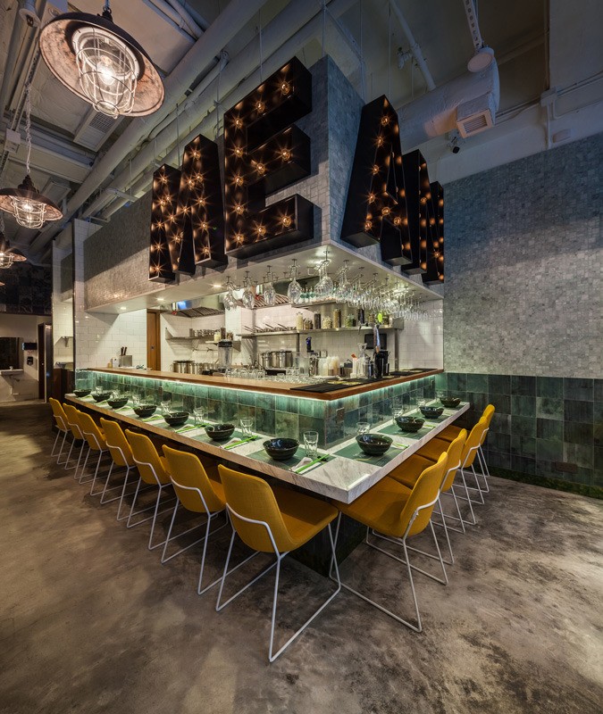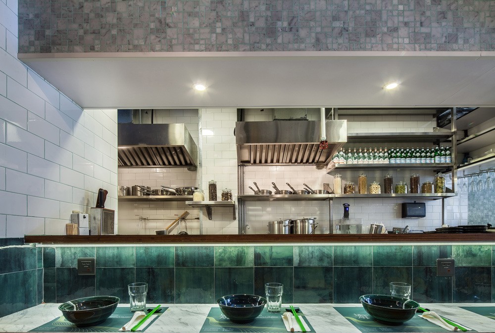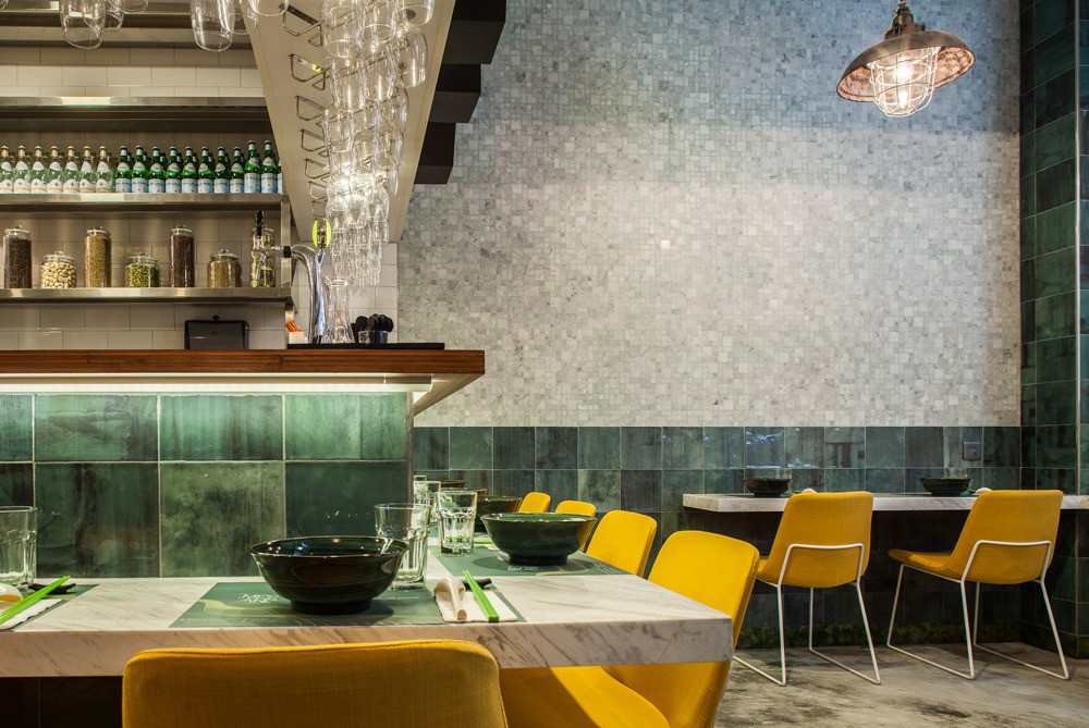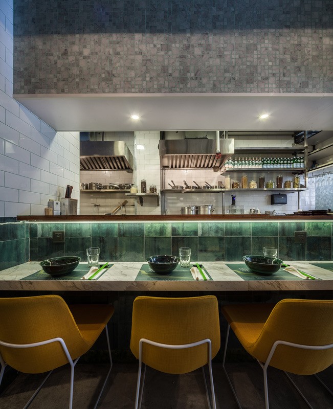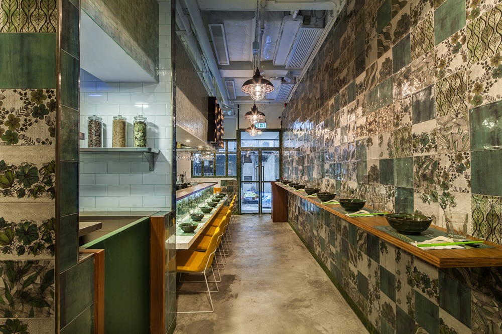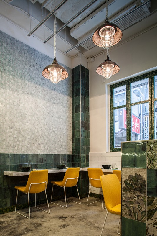 The duo behind the 715-square-foot casual noodle shop, Designer Caroline Chou and Chef Kevin Lim, worked together to create a cohesive experience from the secret alley entrance to the menu, the overall concept, the interior design and even the plating.