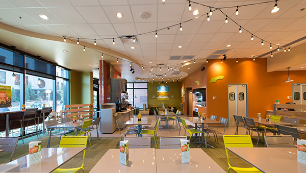 “We wanted to shield the entrance sequence a little bit from the main dining area but not cut it off because we didn’t want the space to feel too small…[The lattice] gives you a sense of division but it keeps the space visually open,” says Kevin Horn, vice president in Calliston RTKL’s Los Angeles office.