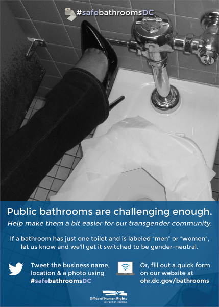 The District requires all single-occupancy bathrooms at restaurants, businesses or other public places to be gender-neutral, without labels such as 'male' or 'female.' "While in the past, non-compliant bathrooms could be reported to OHR through a lengthy form, now community members can alert OHR by tweeting the business name and location using the hashtag #safebathroomsDC, or by submitting a short five-question form on the OHR website," according to an OHR statement announcing the campaign, which features a series of attention-grabbing advertisements.