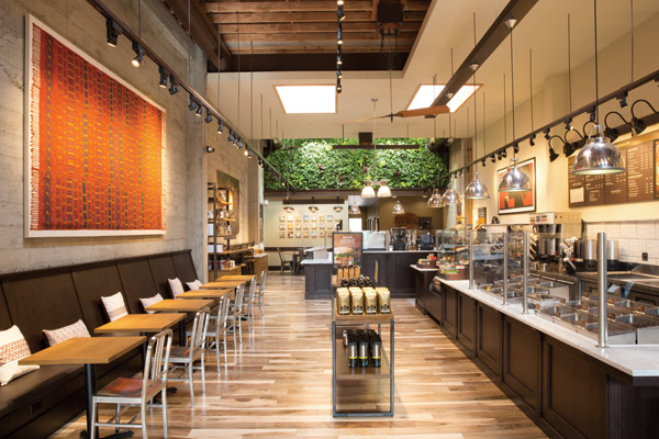 - Design highlights: Original board-formed concrete walls, skylights, espresso-stained oak millwork, Carrara marble counters, showplace barista bar, history wall, local artwork, living wall, walnut floors, Guatemalan tapestry