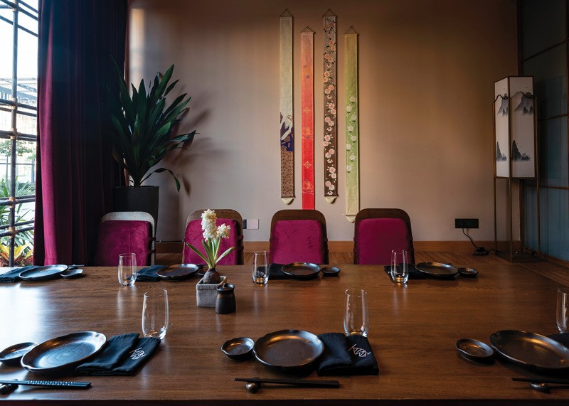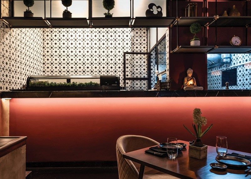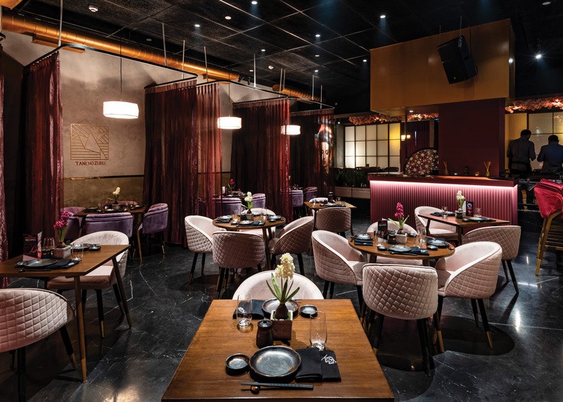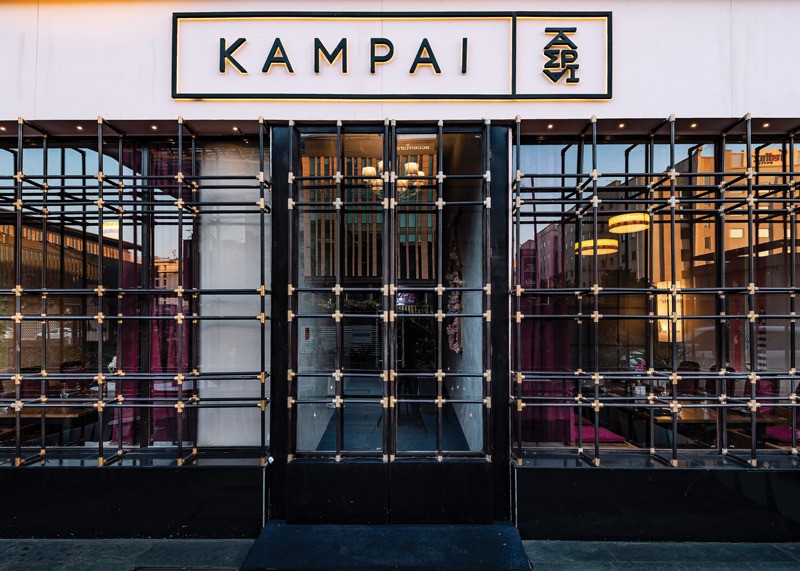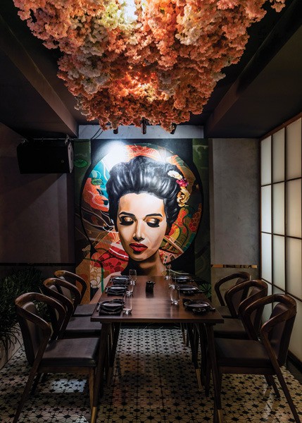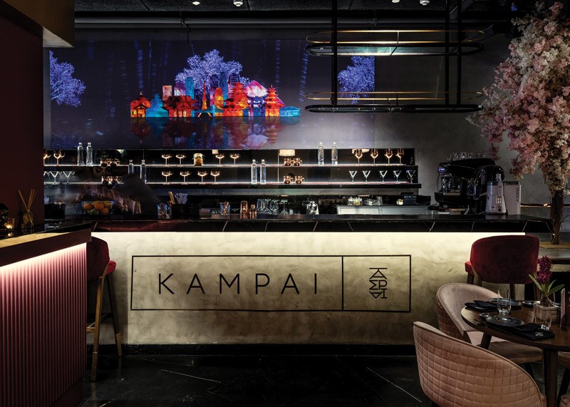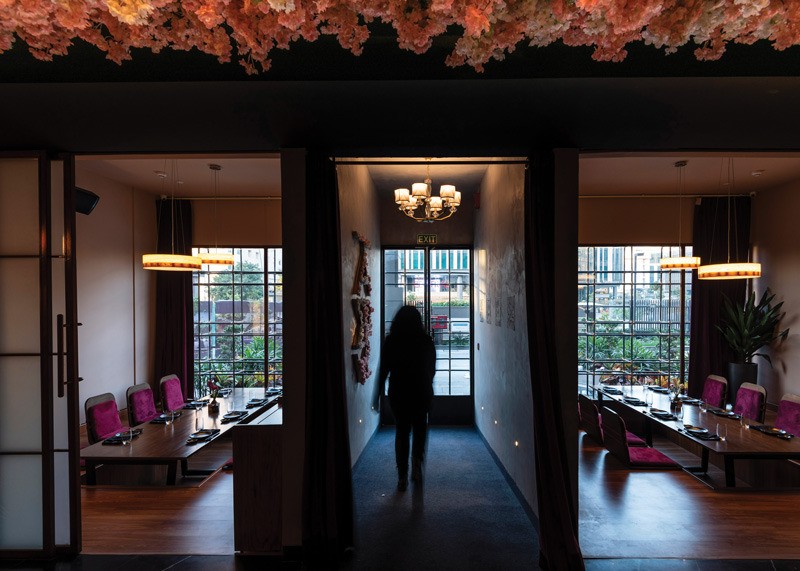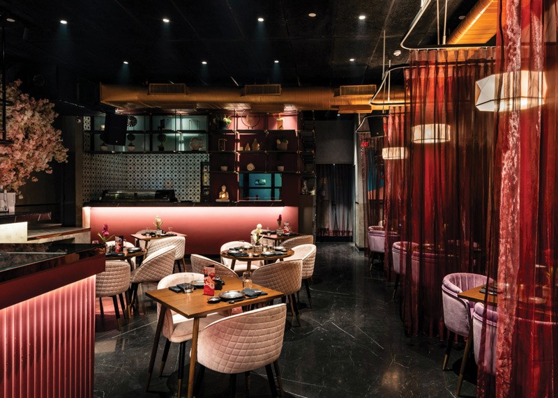Kampai, designed by Chromed Design Studio, is a contemporary Japanese restaurant with traditional underpinnings located in the midst of Aerocity, a luxury mixed-used development in New Delhi, India. Luxurious and romantic, Kampai’s design features layers of fabric and shades of pink. Guests drink and dine under a canopy of cherry blossoms. A mix of seating options offers both standard and traditional Japanese zashiki low tables set on tatami flooring.