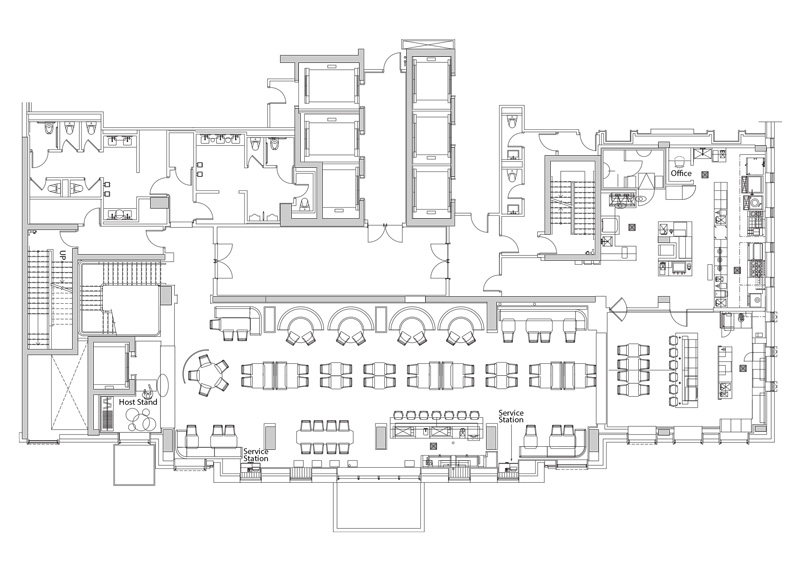The restaurant’s seven-seat bar is positioned centrally against one wall in the dining room. Its placement there is unusual but was done very strategically, according to Khabouth. “Bars are normally toward the front of a restaurant, but we decided to put this one in the middle because the space is so long,” he says. “We wanted to use the bar to animate and add some energy to the center of the room. Keeping it centralized also made for faster, more efficient service because the servers don’t have to walk 100 feet to deliver a drink and come back.”