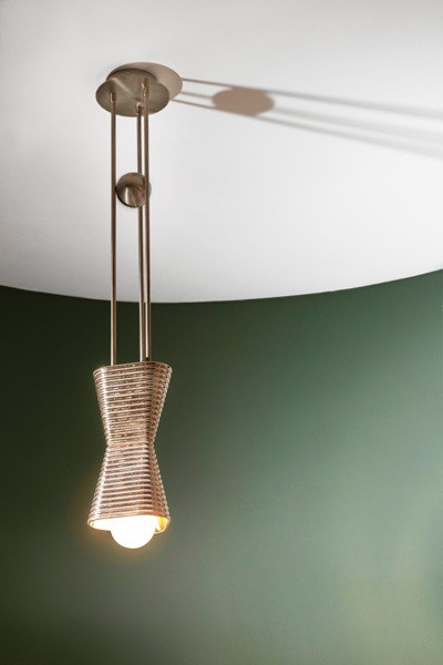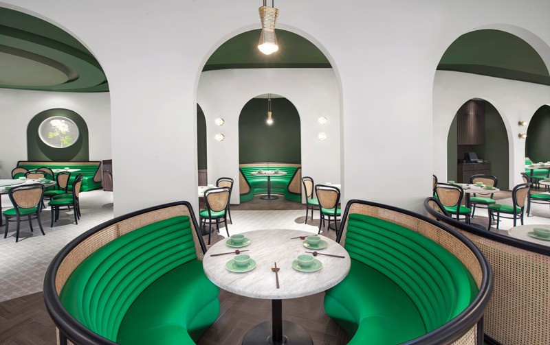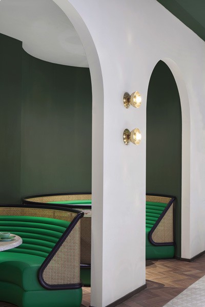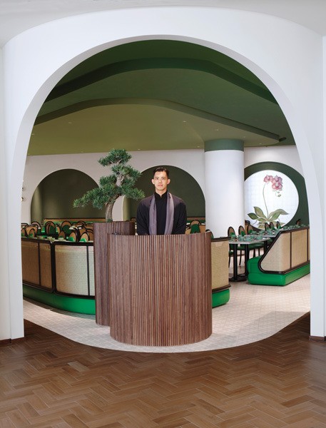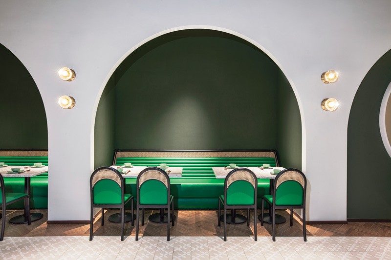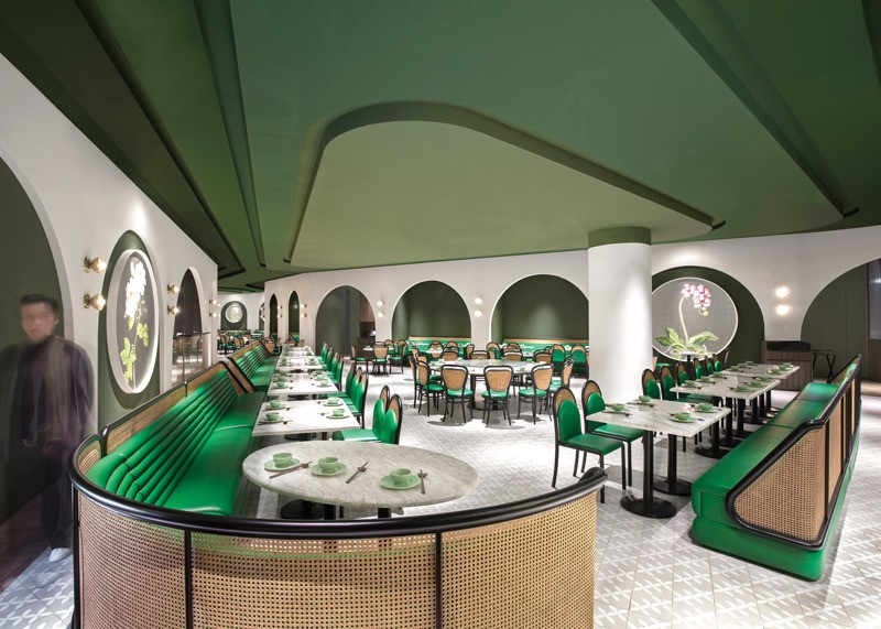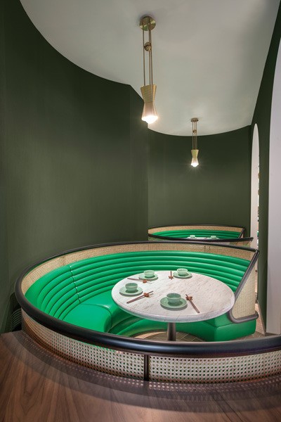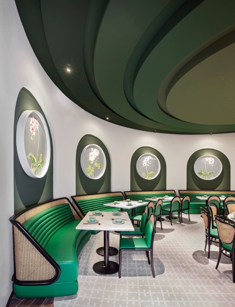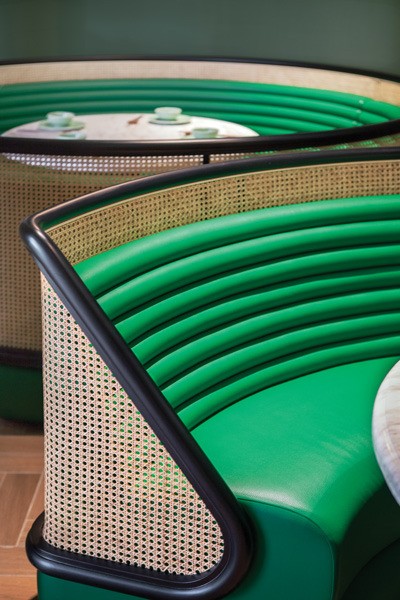 The ceiling and floor are inspired by rural terraced landscapes. The ceiling evokes an inverted topographic map in various shades of green. The furniture — custom “tubular” banquettes with rattan detailing — is in yet another shade of green to suggest the outdoors and provide a respite from urban life in Hong Kong.