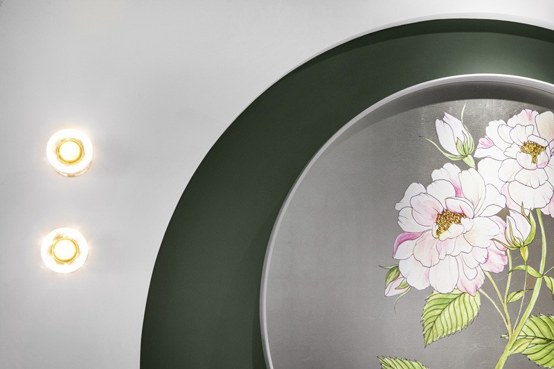 A row of white arches lines the main dining room, providing a sense of mystery and discovery for guests and separating the area from the kitchen, bar, cashier and VIP rooms. Framed floral artwork is set against silver-leaf backgrounds, giving a futuristic twist to the traditional Chinese garden aesthetic.