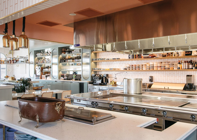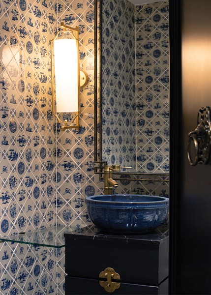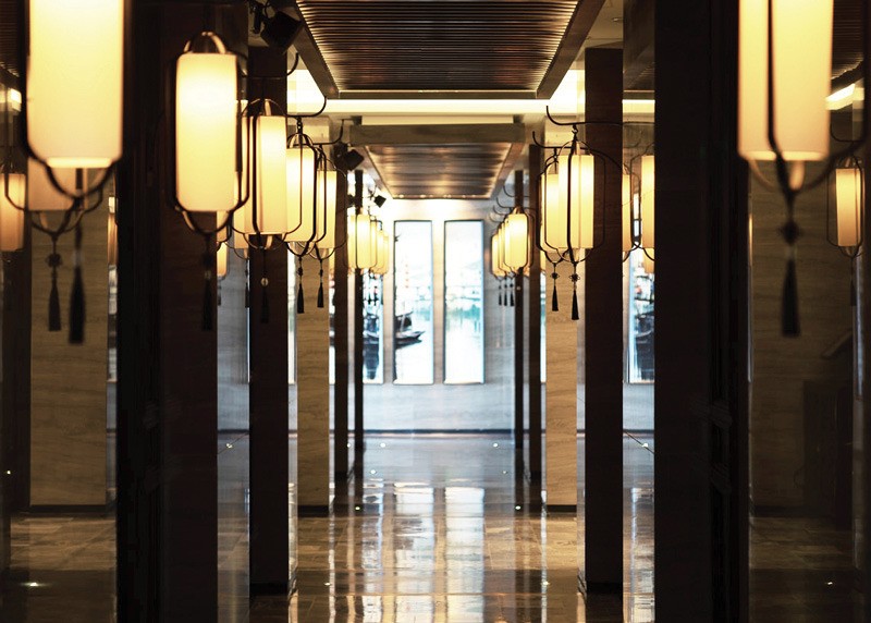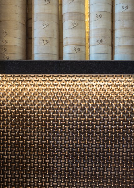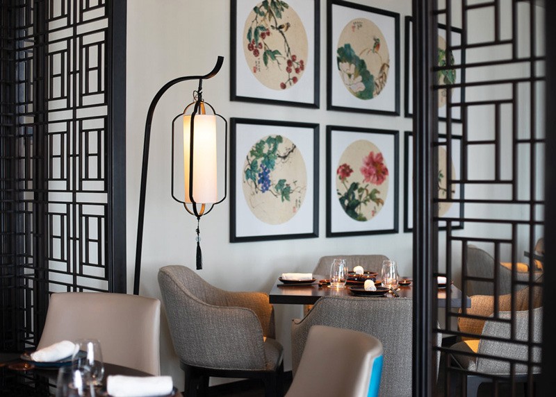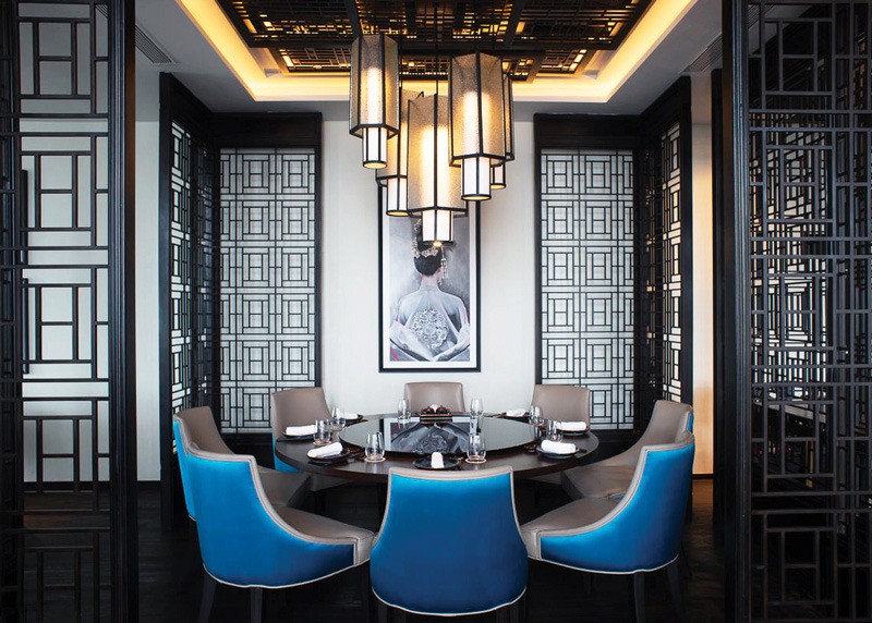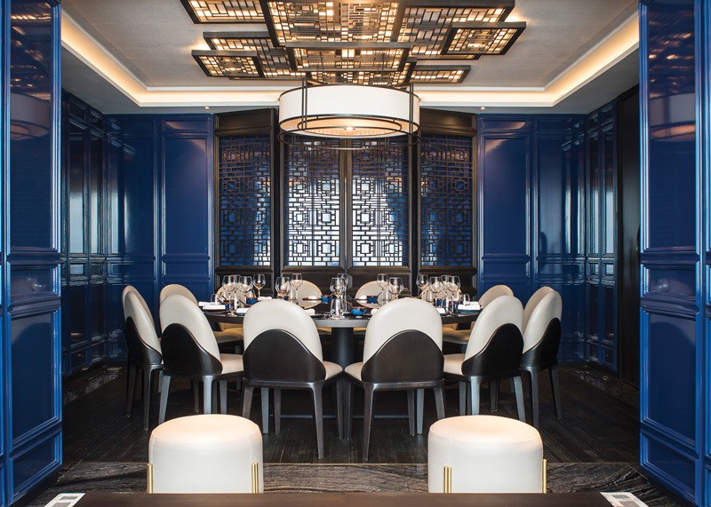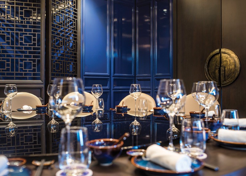 Private dining rooms boast blue lacquered wood panel walls with large round tables encircled by contemporary pale grey leather and dark wood chairs. Traditional backlit trellis details have been set into the walls and ceiling. An oversized modern take on the traditional lantern is suspended above the table. Dark timber and weathered stone feature in the floors.