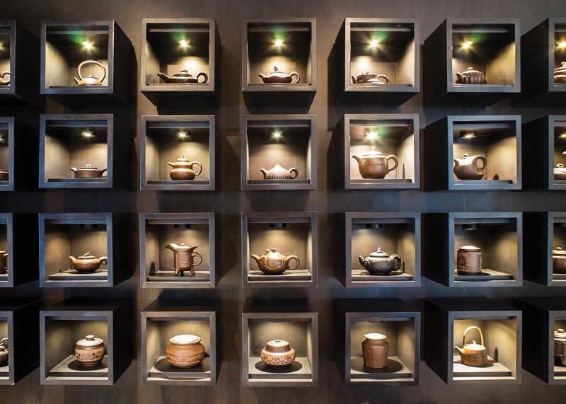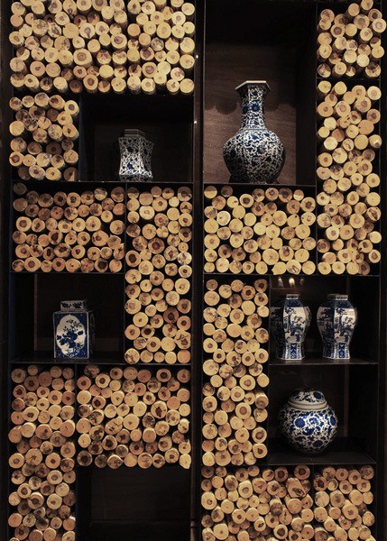 The rustic elements of the wood staircase, meant to evoke a bamboo forest, are contrasted by ornamental ceramic vases.
