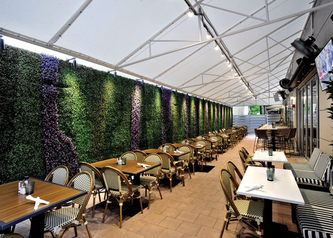 Faux foliage: The outdoor seating space is narrow and long between two tall buildings, so we tried to create an oasis in this busy urban area. Green was very important inside and out. Rather than just a solid tone, the landscape architect included different colors of faux greenery on a long wall enclosing the patio and lighting that highlights it.