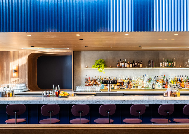 Bar face: We wanted something geometically simple that wouldn’t take away from the back bar or compete with the mosaic tile wall. It has a 3-D cube image that you can also see some of in the big mosaic wall.