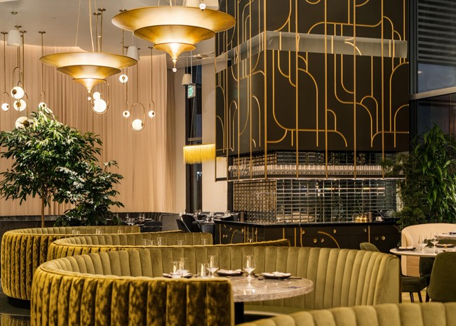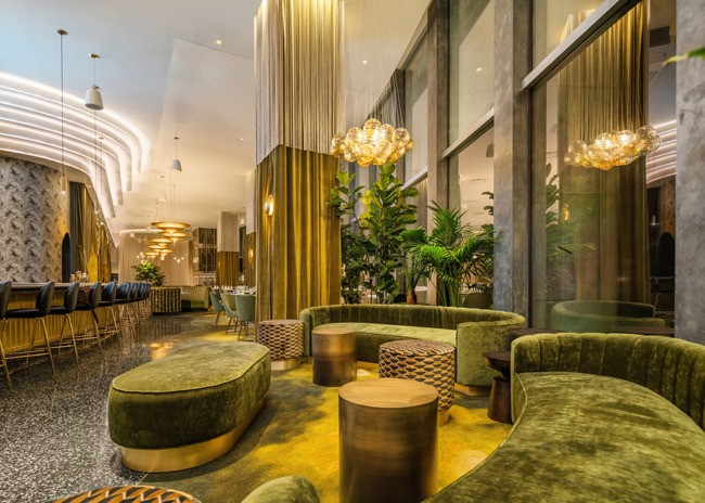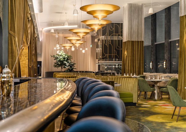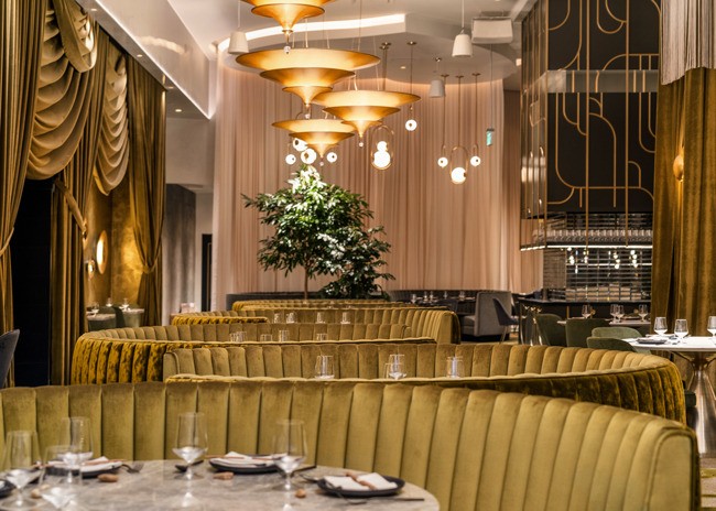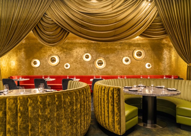 Lush jade-toned velvet-covered booths rise from the floor as cedar trees segue up and into art-deco inspired architectural panels layering the space alongside dramatic curtains, creating a fantastical, theater-life experience. Draped fringe-covered columns contribute to the whimsy, while golden Fortuny chandeliers hang throughout.