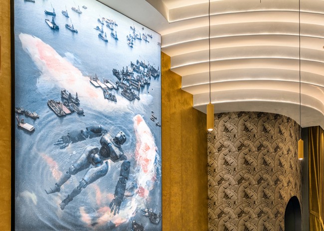The 20-person bar at Animae also provides a feast for the senses. On center stage is a backlit mural of Berlin artists Sauer and Posavec's, Big Chuck, depicting a dystopian mech futuristic battle. It is surrounded by scalloped uplighting from which deco wings spread and take flight.