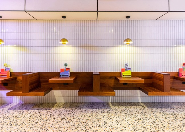 The first floor houses a bright grab-and-go counter. The design teams paired textured white walls with warm wood accents against a classic terrazzo floor.