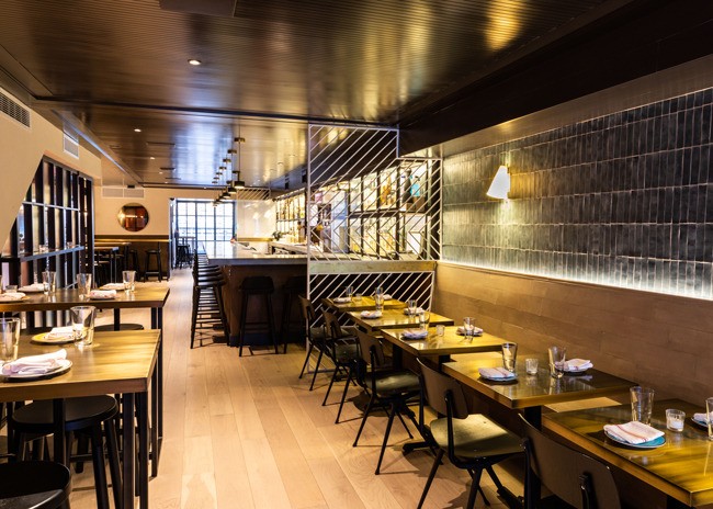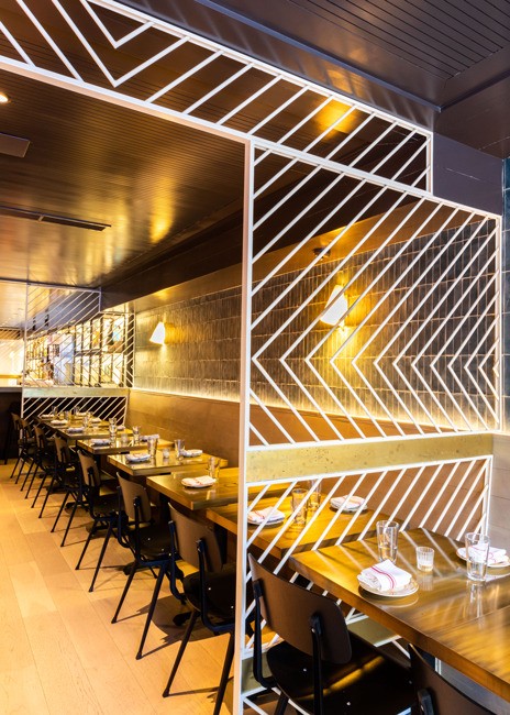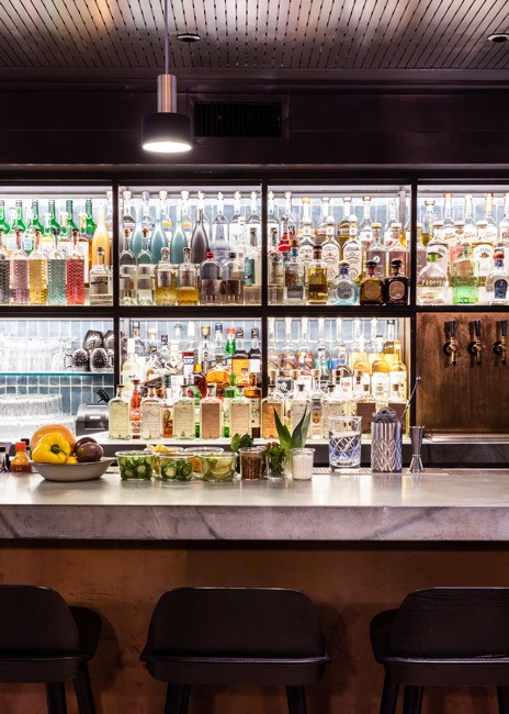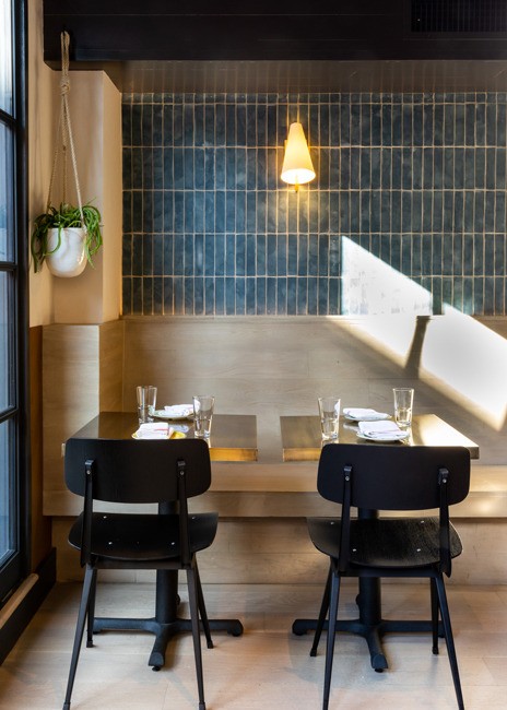 The tone changes upstairs, though, where guests experience a sophisticated space with sculpted lighting, washed-wood flooring and handcrafted green tiles. There’s also an outdoor patio space.