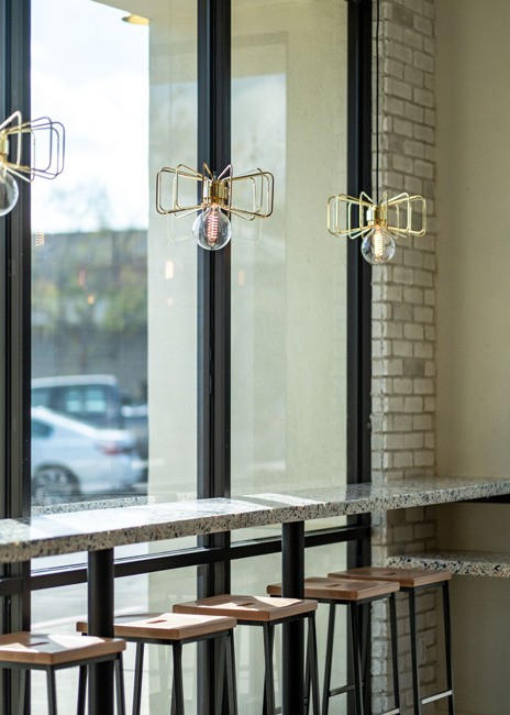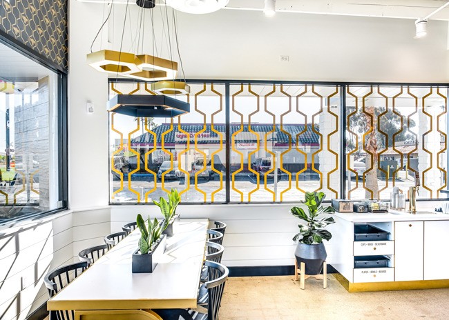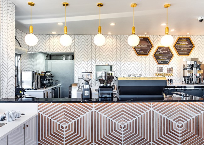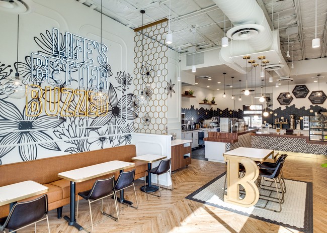 “By providing a bold yet relaxed atmosphere for guests, this space immediately invites customers to experience the buzzing ambiance with beehive inspired motifs placed strategically throughout the space in places such as gold window decals that parallel the drive through,” say Young.