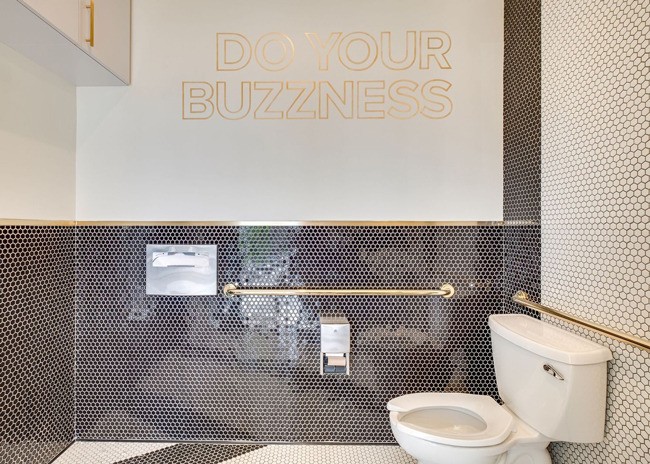 The Better Buzz brand aesthetic even extends to the bathroom, notes Young. Here guests will find the brand’s hex tiles — evoking a honeycomb — and its signature brass color on the cap for the wall tiling and handrails. The bathroom even boasts its own social media moment, a “cheeky” play on words, on the wall, Young adds.