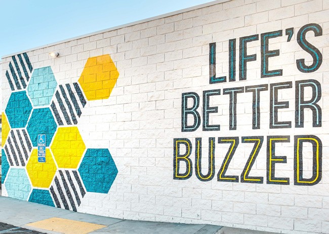 At the Miramar location, MY Studio ID also paid special attention to the restaurant’s exterior, which features another Instagrammable element, a large mural with the “Life’s Better Buzzed” tagline and hex pattern.