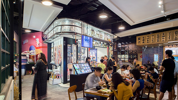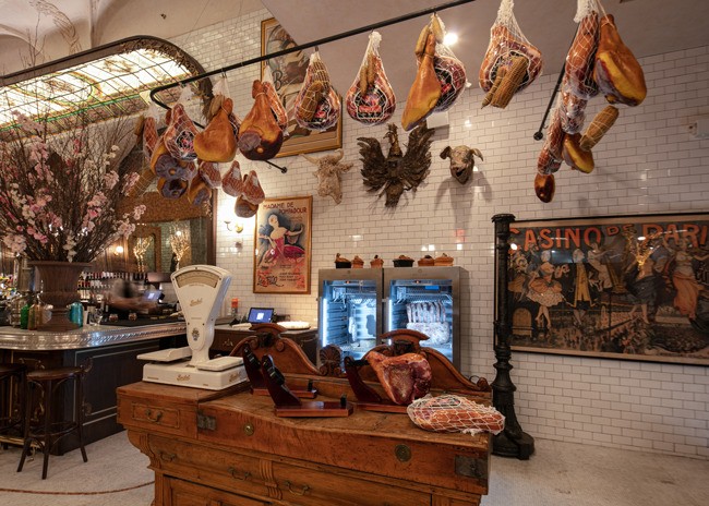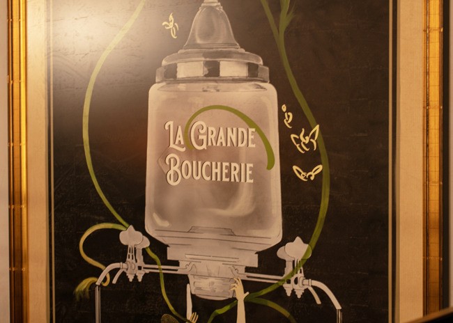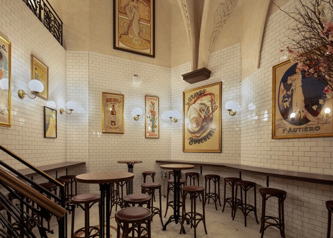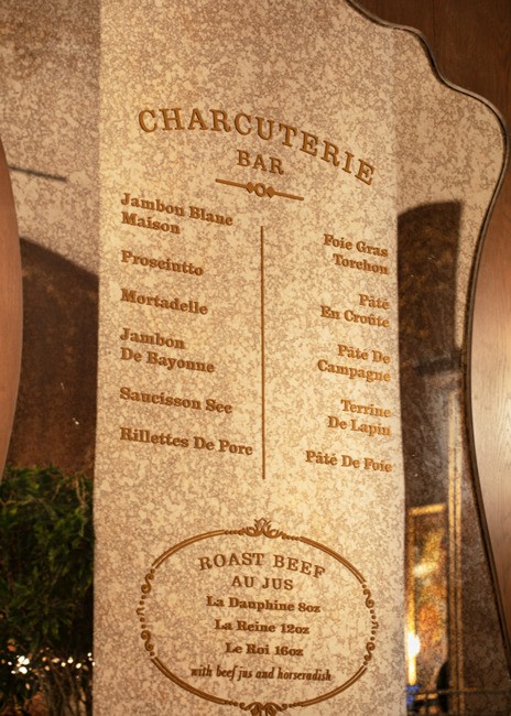From the bar, the restaurant splits into two zones, each a reinterpretation of early 20th-century Parisian dining. On the north side is the casual dining area and on the south side, through stained glass doors, is the formal dining room. Both sides include mezzanine seating. Both sides also incorporate subway tile and artwork that recalls Paris in the 1920s. The casual dining area offers a warm atmosphere that includes a charcuterie bar, oak walls and floors, and booth seating.